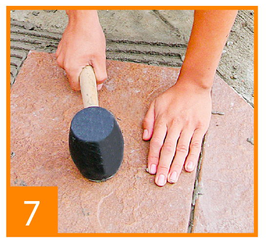 Paso 7: Ajuste la placa golpeán- dola suavemente con el mazo de goma. Luego, con el nivel verifique que todas las placas estén al mismo nivel.