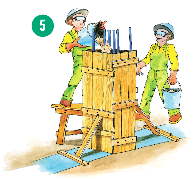 PASO 5 : Con un balde pequeño colocar el hormigón que está en la carretilla en el encofrado que previamente debe estar armado y con el acero de refuerzo. No dejar caer el hormigón de una altura mayor a 2 metros.