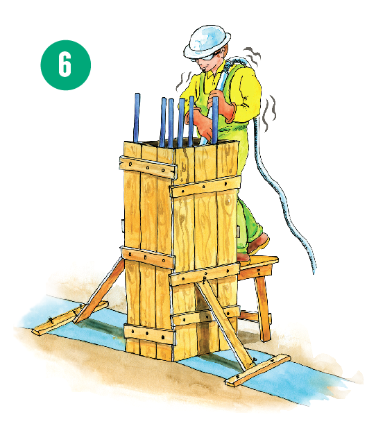 PASO 6 : Compactar la mezcla en el encofrado usando un vibrador verticalmente evitando tocar el acero de refuerzo de la columna o el encofrado. Curar el elemento por 7 días mínimo.