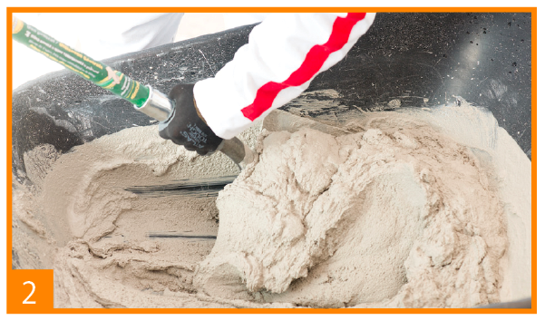 Paso 2: En un recipiente impermeable, dosifique el agua según indica el saco e incorpore poco a poco Enlumax® Capa Gruesa. Mezcle hasta obtener un mortero plástico y homogéneo. Puede mezclar con el mezclador continuo D-20. Deje reposar la mezcla por 5 minutos. Vuelva a batir antes de usar.