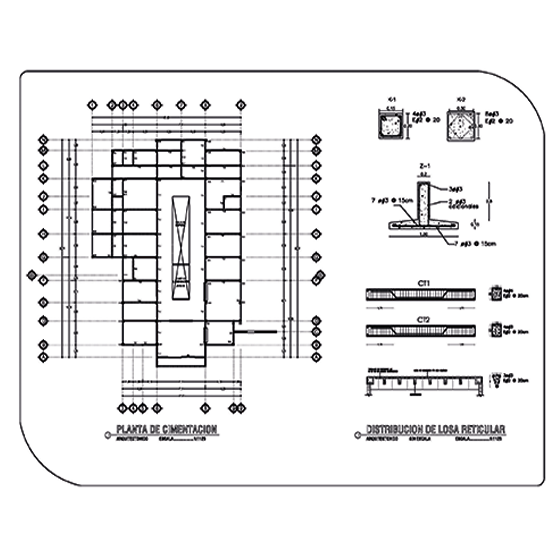 CIMENTACIÓN (A), con su planta general y el detalle de cada uno de sus elementos estructurales, como son: PLINTOS y/o ZAPATAS, RIOSTRAS y/o VIGAS DE ZAPATAS, MUROS, o elementos que se construyen conjuntamente, como: CISTERNAS, ARRANQUE DE ESCALERA, COLUMNAS, etc.