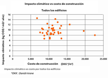 - Esta pregunta fue el eje central de un estudio reciente del Green Building Council de Dinamarca, que buscó determinar si el nivel de sostenibilidad de un edificio impacta directamente los costos de construcción. El estudio examinó 37 edificios certificados bajo el estándar de sostenibilidad de edificios DGNB (una certificación alemana que evalúa la sostenibilidad de los edificios). El gráfico a continuación muestra los proyectos según su costo de construcción por metro cuadrado y su impacto total en el clima, a través de sus emisiones de CO₂. El cálculo de las emisiones se basa en evaluaciones del ciclo de vida durante un período de 50 años. Esto incluye la producción de materiales durante la construcción, su posible reemplazo posterior, el consumo energético operativo del edificio, así como el tratamiento y la eliminación de residuos después de la demolición.