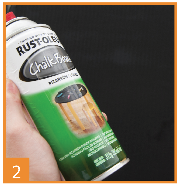Aplicar Rust Oleum Pizarra: Producto en spray que se recomienda trabajar fuera o en un espacio bien ventilado. Agite la lata por 5 minutos y aplique la pintura en capas ligeras. Lo importante es tomarse el tiempo necesario para que quede bien.